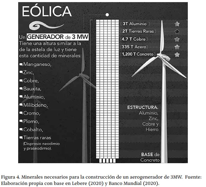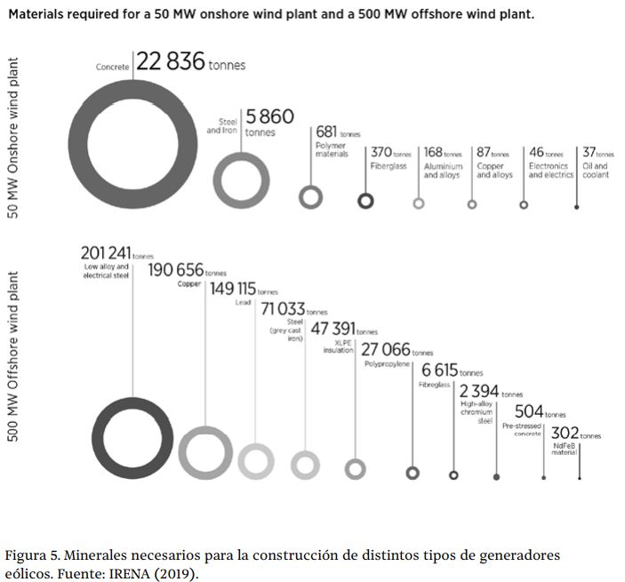 Debido al gran tamaño de los aerogeneradores, su construcción implicará el aumento de la demanda de cobre, aluminio, zinc, molibdeno, tierras raras, acero y concreto. Además, algunas turbinas usan varias tierras raras, como el neodimio, el disprosio, entre otros; pero su cantidad depende del precio de las tierras raras, la eficiencia, y el avance de nuevas tecnologías. Y, a mayor capacidad de producir energía más cantidad de materiales necesitarán (Datos Crucial 14 y 15).