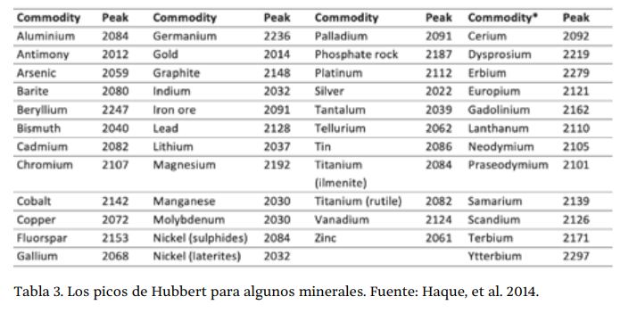 El modelo de Hubbert es una curva que modela la vida útil de un mineral. El modelo toma en cuenta la demanda y escasez del mineral seleccionado, y aporta una fecha en la que el recurso llegará a su punto máximo de producción para después comenzar su descenso. En 2022 algunos minerales como el amonio y el oro ya están en su fase de descenso, de hecho, son pocos los minerales que tendrán recursos para los próximos 100 años (Dato Crucial 21). En el futuro la extracción de minerales tendrá distintos niveles de escasez en el mercado; en consecuencia, habrá conflictos socioecológicos para obtenerlos y usarlos.