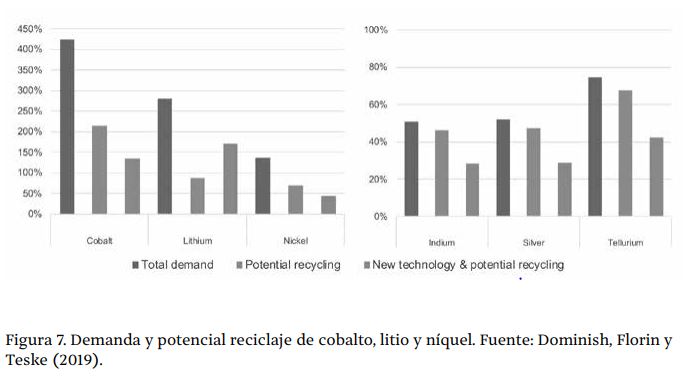 Uno de los problemas para el reciclaje es que, en algunos casos, como el litio de las baterías, cuesta más reciclar que explotar y extraer el mineral. En consecuencia, hay pocos incentivos para fomentar el reciclaje. Es probable que con el aumento de la producción de baterías de litio el precio del litio reciclado baje; pero, aun así, el litio reciclado no logrará satisfacer la enorme demanda de este mineral (Dato Crucial 22).