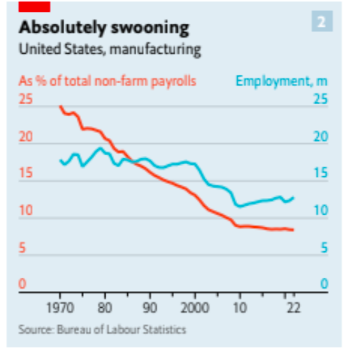 6) Para ilustrar mejor el caso del sector manufacturero en Estados Unidos, conviene citar las dos gráficas proporcionadas por The Economist:
