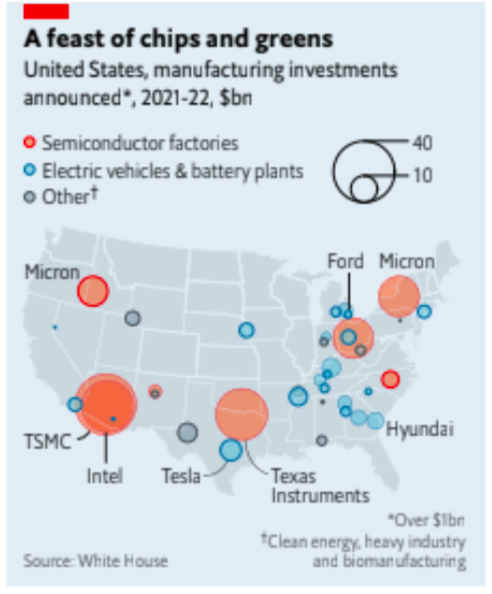 4) No solo se promueve la producción a nivel nacional. A nivel estatal, los estados también están incentivando a que las empresas trasladen su producción a sus territorios. Se puede citar a Georgia y el subsidio por 3 mil millones de dólares (mdd) a dos fabricantes de automóviles eléctricos, o bien, a Michigan que no ha querido quedarse atrás después de ver que Ford planea construir complejos en Kentucky y Tennessee; ahora está preparando todo para que las empresas puedan construir infraestructura en la zona sin ningún problema.