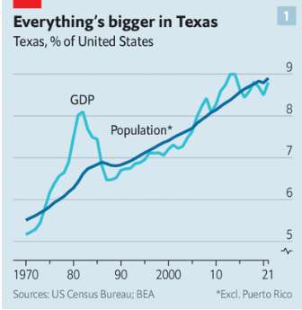 1. De 2010 a 2021, Texas aumentó su población 22%, triplicando su tasa nacional. Su economía creció 46% durante el mismo periodo.