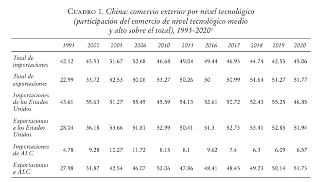 2. Para el periodo de 1995 a 2020 las importaciones totales de contenido tecnológico medio y alto de China alcanzaron su máximo en 2003 con 53%, y desde entonces han disminuido significativamente hasta 45.06% en 2020. Por otro lado, las exportaciones de China de nivel tecnológico medio y alto aumentaron de niveles inferiores a 23% en los años noventa a 33.72% en el 2000 y desde 2005 a niveles superiores a 50%; en 2020 fueron de 51.77%.