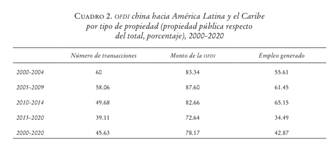 3. Entre 2000 y 2020, el sector público chino fue responsable del 78.17% de la OFDI de China en la región, del 45.63% de las transacciones y del 42.87% de los empleos generados.