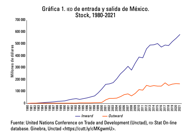 A nivel internacional el crecimiento (e incremento) de la IED sucedió a causa de la globalización que trajo consigo la apertura de muchas economías al comercio internacional, sin embargo, con la crisis financiera de 2008 la tendencia cambió. En el caso mexicano, el crecimiento de la IED se remonta a la etapa de industrialización del país acontecido durante El Porfiriato como primer momento para posteriormente consolidarse en la etapa revolucionaria con el arribo de capital estadounidense (principalmente) para sectores como automotriz, química, farmacéutica, de tabaco, etc. El dinamismo en la inversión se vio potenciado por el abandono del modelo proteccionista —sustitución de importaciones— a finales de los ochenta para abrir la economía al comercio internacional, un hecho que también vio la salida de capital de empresas mexicanas hacia el extranjero.