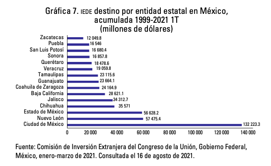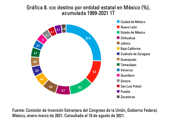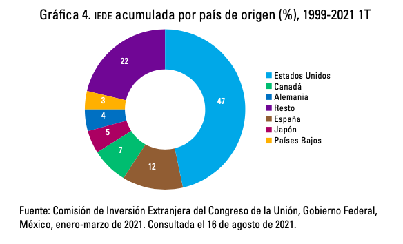 • La IEDE en México es un eje importante para el crecimiento de la economía, así puede observarse en la relación con el Producto Interno Bruto (PIB) y el total de la inversión pública. Los principales capitales extranjeros en el país son de procedencia estadounidense, si bien es cierto ha perdido presencia con la aparición de nuevos inversores como China, aún existe mucha dependencia de la IEDE estadounidense, por lo que se llama al estado a crear políticas industriales para diversificar la inversión y homogenizarla en todo el país.