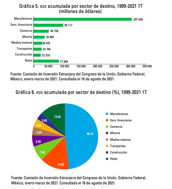 6) Las gráficas 5 y 6 muestran la inversión acumulada en cada uno de los sectores económicos mexicanos donde es clara la supremacía del sector manufacturero (48.1% del stock acumulado) seguido del sector financiero (14.6%), el comercio (12.5%) y la minería (7.5%).