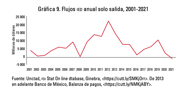 11) La gráfica 9 muestra la IEDS de las empresas multinacionales mexicanas (EMN) en el periodo 2001-2021.