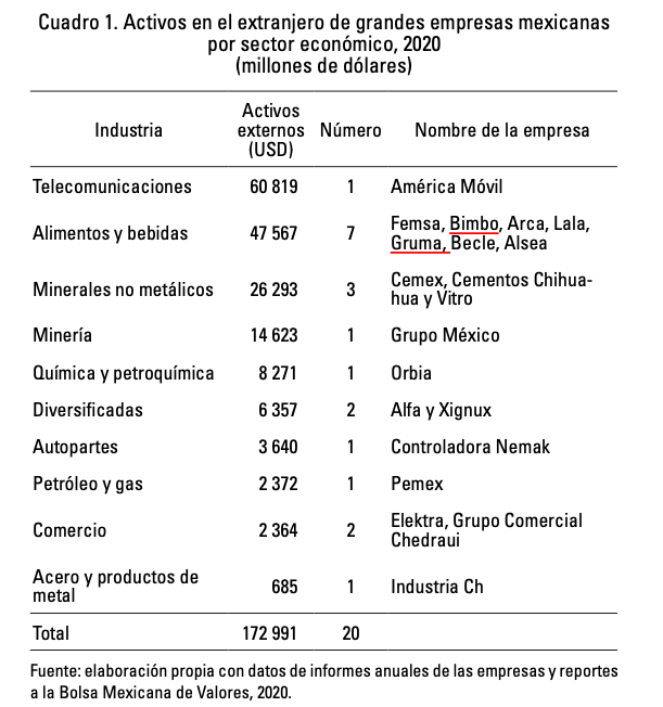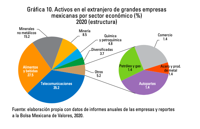 Las empresas que figuran en el mercado internacional son giros que corresponden en su mayoría a sectores tradicionales como la de los alimentos (Femsa, Bimbo, Arca, Lala, Gruma, Becle y Alsea) y de la construcción (Cemex, Cementos Chihuahua y Vitro), con la única excepción del de telecomunicaciones (América Móvil, la mayor EMN mexicana). En suma, los tres sectores representan 80% de las EMN mexicanas. Empero, la promoción de la industria mexicana alrededor del mundo, traducido en importaciones, no es de la misma magnitud ya que solo las multinacionales mexicanas de autopartes logran generar cadenas de valor hacia adelante y hacia atrás significativas, en comparación con las de los sectores más tradicionales.