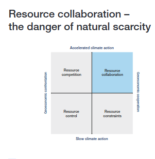 - Colaboración de recursos, el peligro de la escasez natural: la cooperación permite un combate efectivo al cambio climático y las cadenas de suministro flexibles absorben buena parte de los efectos del cambio climático en la producción de alimentos. Aunque no se puede evitar la escasez de agua, y minerales; y el estrés hídrico genera crisis sanitarias y humanitarias en los países en desarrollo.
