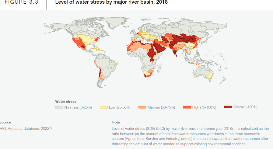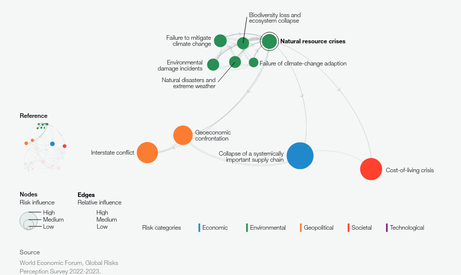 - Recursos restringidos, el miedo de la angustia divergente: las actuales crisis entorpecen la acción climática, y exponen a los países más vulnerables a la hambruna y crisis energéticas. La escasez de agua y minerales potencia otros riesgos. Los países en desarrollo enfrentan una crisis humanitaria causada por el impacto del cambio climático en los alimentos y el agua, por interrupciones del comercio global, y por la inestabilidad político-económica.