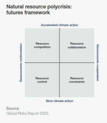 Para que en 2030 se pueda nivelar la oferta y la demanda de los recursos críticos, así como mitigar la escala de la policrisis son necesarios dos elementos clave: una cooperación mundial que permita el flujo transnacional de recursos, y mitigar el impacto del cambio climático en el suministro de recursos a la par de una veloz transición energética. La forma en que se den estos dos ejes plantean cuatro posibles futuros para 2030: