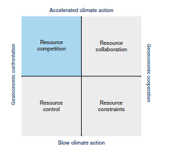 - Recursos limitados, el peligro de guerras por los recursos: es el peor escenario. El control militar de metales y la dinámica geopolítica potencian la escasez de agua y alimentos provocada por el cambio climático. Esto desencadena una crisis mundial con severos impactos socioeconómicos generalizados, la guerra geoeconómica se extiende y el enfrentamiento entre estados se vuelve uno de los pocos mecanismos para garantizar el abasto de los insumos básicos.