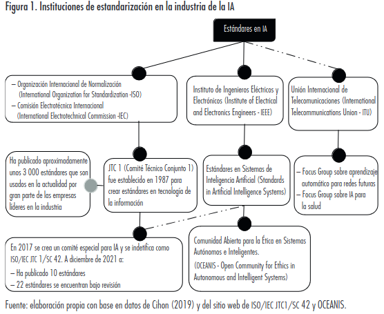 Gran parte de los actuales y futuros beneficios de la IA se deben a procesos de estandarización de difícil acceso y comprensión para el público. Para caracterizar los procesos de estandarización hay que tratarlos como una institución de coordinación. Esta institución se caracteriza por la cooperación y la concurrencia que facilitan la expansión de la industria, y posibilitan la interoperatividad entre diferentes dispositivos de IA. Actualmente hay dos organismos que realizan los procesos de estandarización, el Comité Técnico Conjunto 1 (JTC 1, por su sigla en inglés), y el Instituto de Ingenieros Eléctricos y Electrónicos (IEEE, por su sigla en inglés).