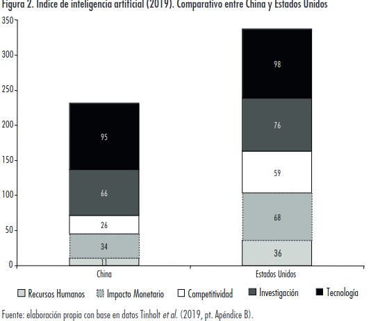 2.- De acuerdo con Elsevier SCOPUS, en 2017 el impacto del trabajo científico de China en materia de IA se ubicó en el puesto 34. En esa misma época, Estados Unidos tenía 4 804 científicos publicando artículos Nivel 1, de acuerdo con la clasificación usada por la Academia de Ciencias de China, mientras que solo había 2 267 científicos chinos publicano en ese nivel.