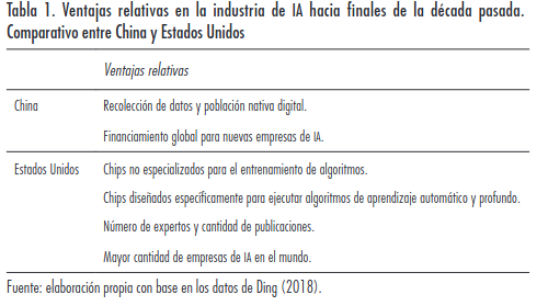 El artículo traza varias de las estrategias e instituciones mediante las que China impulsa su industria de IA; y con las que busca posicionarse como líder mundial de ésta. Además, es relevante que ubica algunos de los mecanismos mediante los que la potencia asiática define sus relaciones con las empresas extranjeras, tomando posturas diferentes dependiendo si es al interior de sus fronteras o en el territorio estadounidense; pero que esos tratos diferenciados son útiles en su estrategia para liderar el sector de la IA. Esta evaluación combina los desarrollos tecnológicos e infraestucturales con cuestiones institucionales como la planeación y la estandarización, factores todos fundamentales para evaluar la competencia global en el campo de la IA. Se destaca la alta inversión de China en esa actividad y su acercamiento a la potencia líder, Estados Unidos.