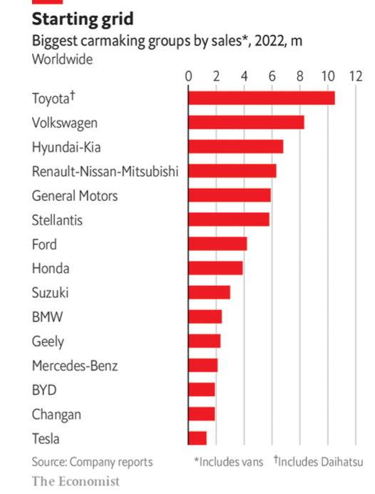 6) China representa 6.1 millones de ventas de lo que llama vehículos de nueva energía (EVs y phevs). No obstante Tesla es el fabricante de vehículos eléctricos más grande del mundo con un cierre de ventas en 2022 de 1.3 millones de automóviles. Byd de China ocupa el segundo lugar en automóviles que funcionan solo con batería y muy por delante con vehículos de nueva energía. Volkswagen es el electrificador más audaz de los fabricantes de antaño pero ocupa el tercer lugar con 570 mil ventas de vehículos EV (7% de su total).