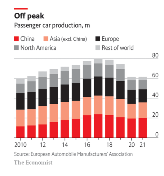 10) Para 2022 la producción mundial de automóviles había caído alrededor de 62 millones.