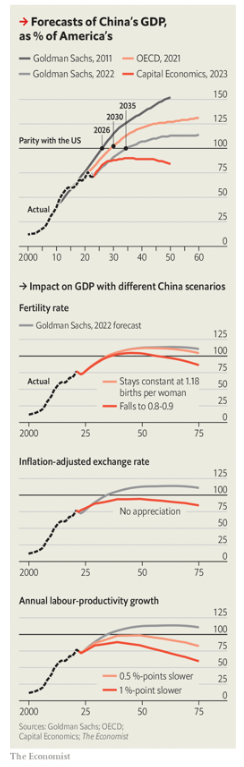 1) En 2011 Goldan Sachs pronosticó que el PIB de China superaría al de Estados Unidos en 2026 y llegaría a ser 50% más grande a mediados del siglo XXI. Sin embargo, a fines de 2022, el banco actualizó sus pronósticos dando como resultado que la economía china no superará a la de Estados Unidos hasta 2035, y en tal caso, su punto más alto solo será 14% más grandes que la economía estadounidense.