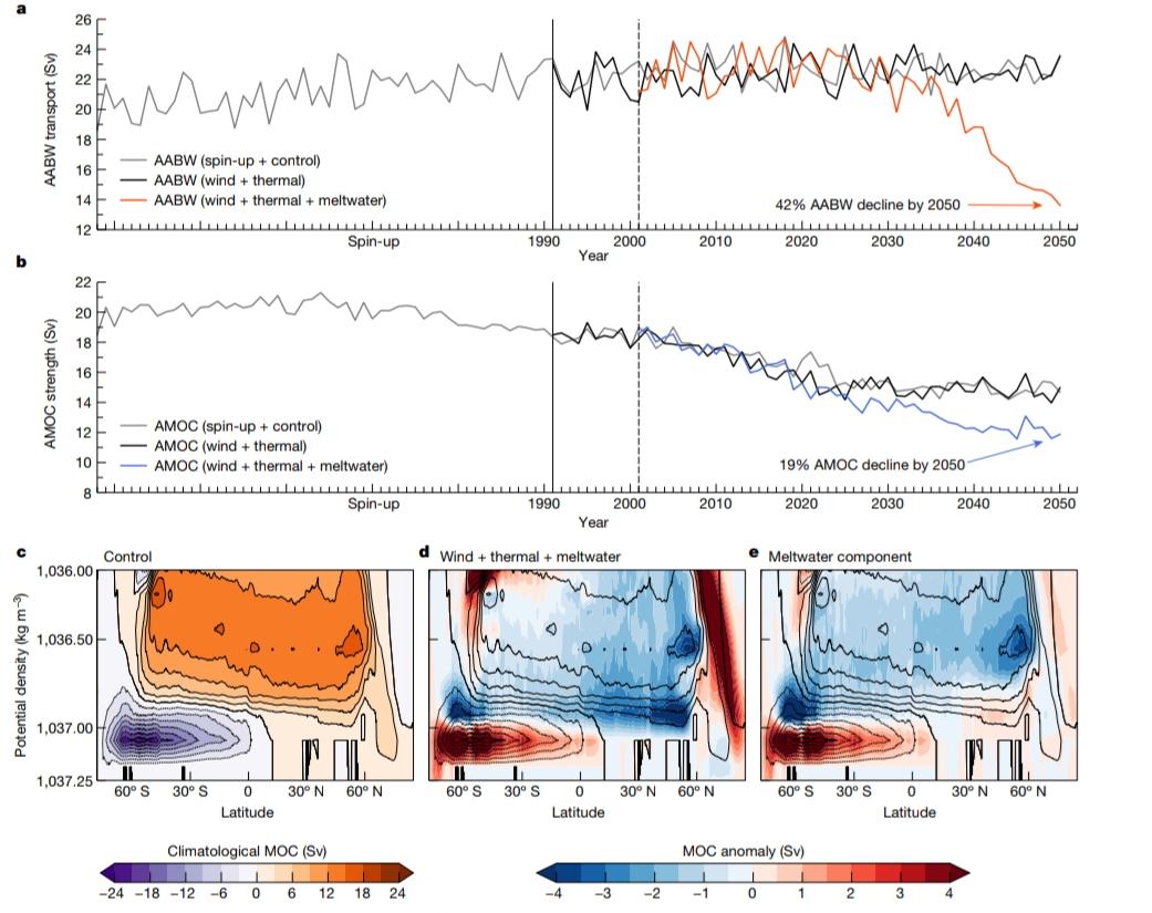 5. La fuerza de AMOC se define como la función máxima de la corriente de vuelco a 45° N. A medida que la liberación de agua de deshielo de Groenlandia y la Antártida aumenta con el tiempo, la fuerza de vuelco del AABW y la fuerza de AMOC se debilitan para 2050. Se prevé que la fuerza de la celda de vuelco AABW y la AMOC disminuya en un 42 % (10.0 Sv) y un 19 % (2.8 Sv) para 2050, respectivamente. El forzamiento del agua de deshielo impulsa prácticamente toda la reducción en el vuelco en la celda AABW, con el envejecimiento del agua de mar a lo largo del camino de salida de AABW.