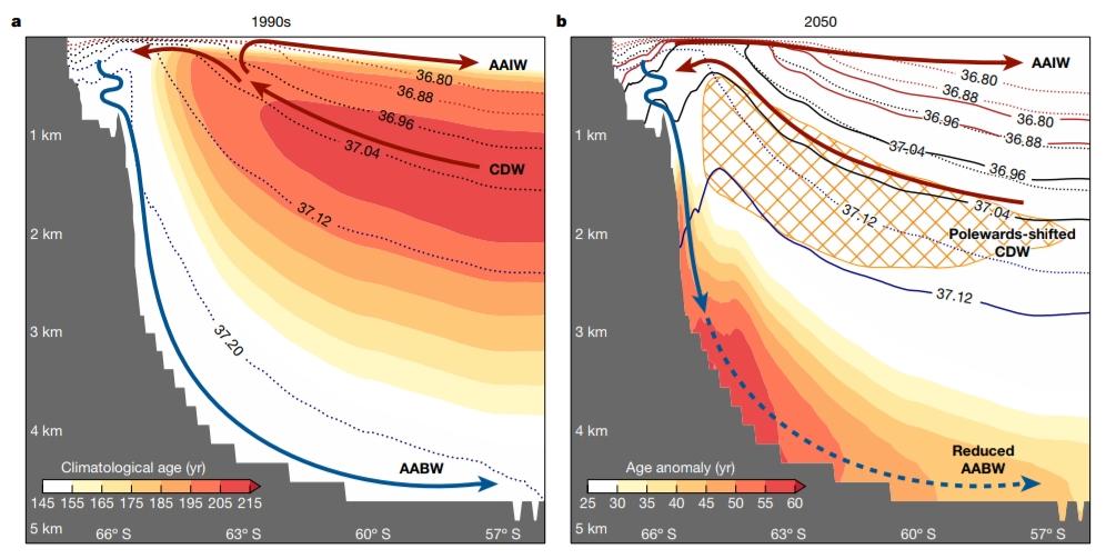 De acuerdo a los modelos utilizados en el artículo, se observó que el agua de deshielo alrededor de la Antártica provoca que se de una contracción del fondo antártico (AABW, por sus siglas en inglés), causando que el agua profunda circumpolar acceda a la plataforma continental. Al disminuir la formación de AABW se obtiene un mayor calentamiento y a su vez un envejecimiento del océano abisal.