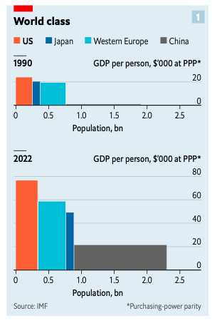 2) En término de PIB, 25.5 billones de dólares (bd) de Estados Unidos alcanzados en 2022, representaron 25% del total mundial (casi la misma cuota que en 1990) mientras que la cuota china es de 18%.