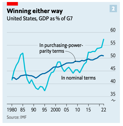 Si se considera la paridad del poder adquisitivo (PPA) como medida para comparar el bienestar de la población de un país visto desde la capacidad de compra de sus residentes, entonces Estados Unidos ha sido superado por la economía china la cual ha sido superior en ese indicador desde 2016. Sin embargo, la PPA no es el indicador correcto para mostrar la capacidad de una economía en el escenario mundial, como sí lo es el tipo de cambio; si es visto desde este indicador, entonces la supremacía estadounidense es innegable (datos cruciales 1 y 2).