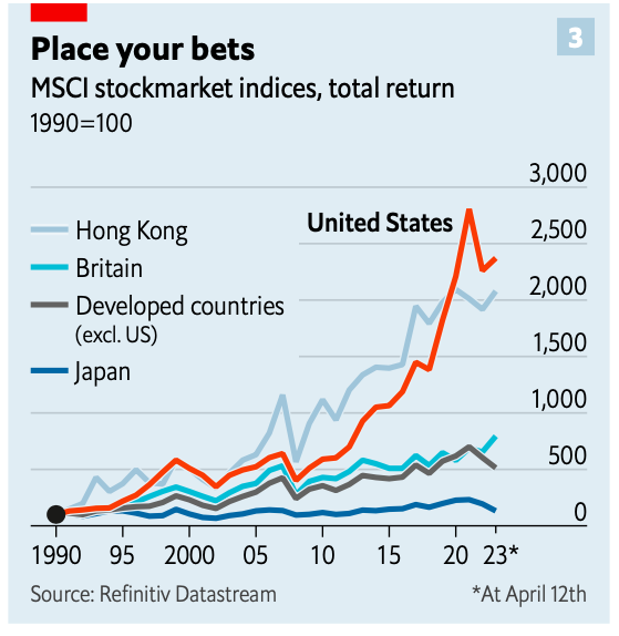 12) 100 dólares invertidos en el S&P 500 (un índice bursátil de las mayores empresas de Estados Unidos) en 1990 valen hoy 2 300 dólares. Por el contrario, si alguien hubiera invertido la misma cantidad en la misma época en un índice similar que excluyera a las acciones estadounidenses, entonces ahora solo tendría 510 dólares. En este marco, la gráfica 3 representa dicho argumento, mostrando la supremacía del mercado bursátil estadounidense, similar al de Hong Kong.