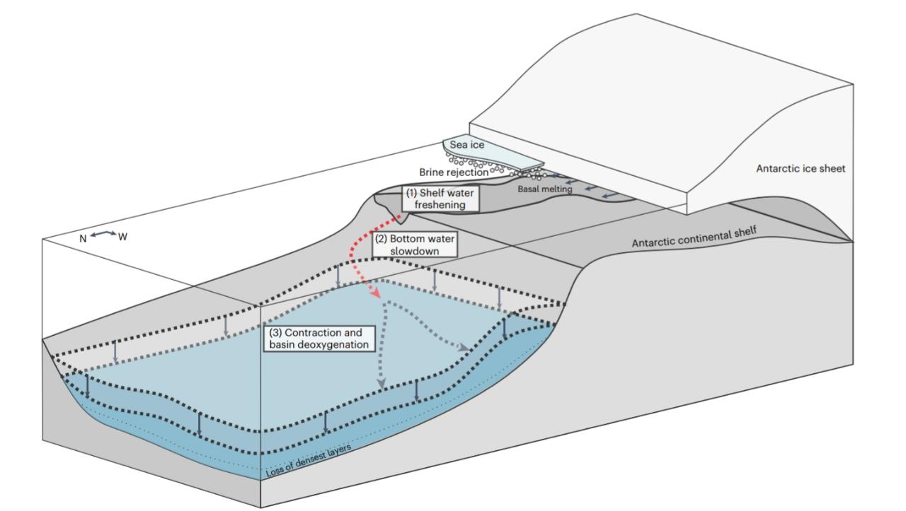 Con las estimaciones obtenidas sobre la cantidad de oxígeno, se determinó que RSBW y ALBW son las que aportan mayor oxígeno a la cuenca antártica australiana. La desaceleración de la circulación de vuelco provoca la desoxigenación en las profundidades del océano, bajo esta información, se pueden conocer los mecanismos de ventilación, entre los que se encuentran la desaceleración del vuelco que reduce el transporte de oxígeno al abismo y la contracción de AABW provoca desoxigenación cuando la capa de AABW se adelgaza. Con esto, se puede decir que la contracción de AABW contribuye más a la desoxigenación que lo que contribuye las reducciones en la cantidad de oxígeno transportado al abismo.