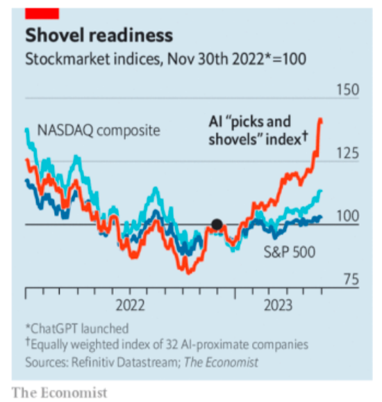 The Economist realiza un balance de las ganancias derivadas del despliegue inicial de la inteligencia artificial (IA) generativa, tanto para los creadores como para los proveedores de la infraestructura necesaria para su funcionamiento, destacando el papel que ha jugado el mercado bursátil para incrementar el valor de las acciones de diferentes empresas tecnológicas.