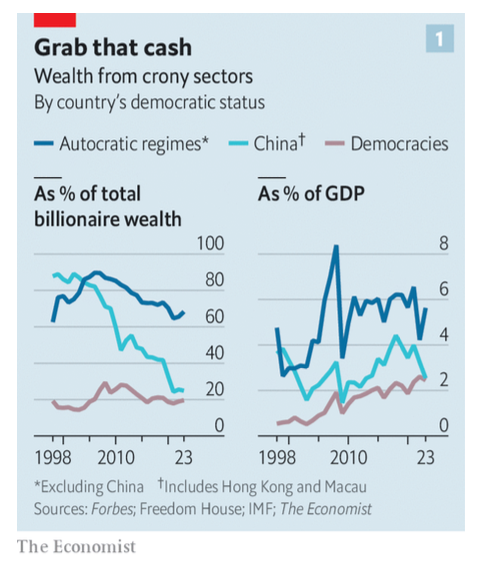 The Economist recupera la tesis liberal que diferencia actividades ilegales de actividades legales, y las asocia con la dicotomía democracia-autocracia, para destacar la importancia de las prácticas reconocidas como corruptas e ilegales en la generación de riqueza en el capitalismo en decadencia. Con excepción de China, el capitalismo de compadres se fortalece, rasgo que habla del debilitamiento de la acumulación de capital que debe recurrir a traspasar las fronteras de la legalidad burguesa. De manera paradójica, ese recurso habla también de la debilidad de los controles estatales y la "tolerancia" social hacia las expresiones más nefastas del capitalismo como con la cleptocracia y la extrema concentración de la riqueza.