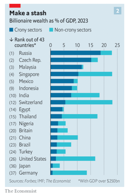 En esta ocasión, The Economist hace una reevaluación de su índice “Capitalismo de compadres”, el cual es un indicador de elaboración propia que muestra los nexos entre los multimillonarios con empresas y el estado para hacerse de tratos especiales y así consolidar y acrecentar su riqueza.