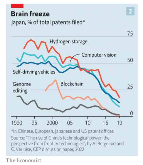 19) En un análisis publicado por el Centro de Rendimiento Económico de la London School of Economics, la contribución de Japón a la edición del genoma y la tecnología del blockchain se ha recudido prácticamente a nada. De acuerdo con la gráfica 2, el papel de liderazgo japonés en el almacenamiento de hidrógeno, los vehículos autónomos y la visión por ordenador, se ha reducido a un papel secundario por detrás de Estados Unidos y China.