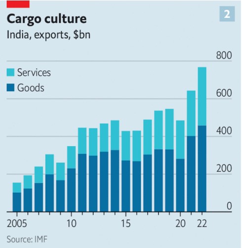 14.-El último trimestre de 2022 la industria manufacturera india creció 4.5%, y representó 17% del PIB. Un tercio del crecimiento de las exportaciones de bienes de viene del petróleo ruso que compra India para luego refinarlo y volverlo a exportar. De hecho, la participación de India en las exportaciones mundiales de bienes solamente pasó de 1.6% en 2012 a 1.8% en 2022.