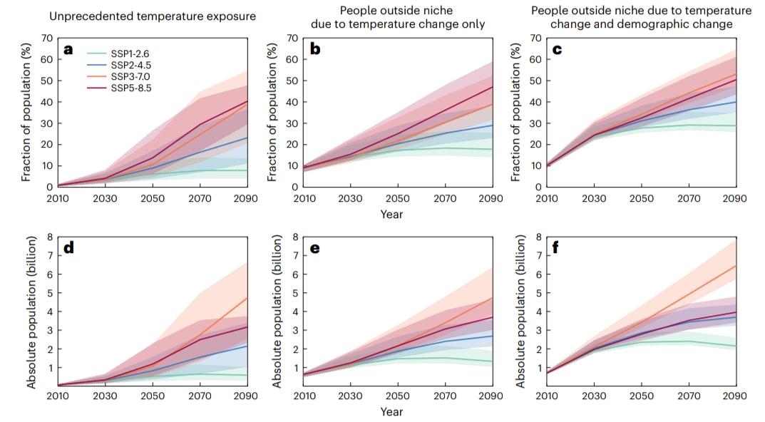 Al combinar las estimaciones de exposición fuera del nicho con la temperatura y la precipitación son aproximadamente 20% mayores que para un nicho de solo temperatura. Continuar con un desarrollo alimentado por combustibles fósiles expone a una gran parte de la población a un calor sin precedentes o a que una parte de la población sea expulsada del nicho debido al cambio climático. Mientras que la vía de rivalidad regional pone en riesgo a una mayor proporción de población debido al cambio climático y demográfico combinados.