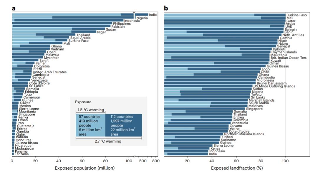 Con las estimaciones realizadas, se puede prever que la exposición a temperaturas medias sin precedentes aumente de manera notable, aumentando a su vez la exposición a temperaturas extremas. Países como India y Nigeria ya presentan puntos críticos de exposición al calor extremo como consecuencia del calentamiento.