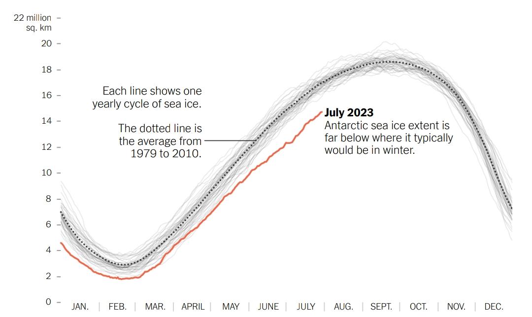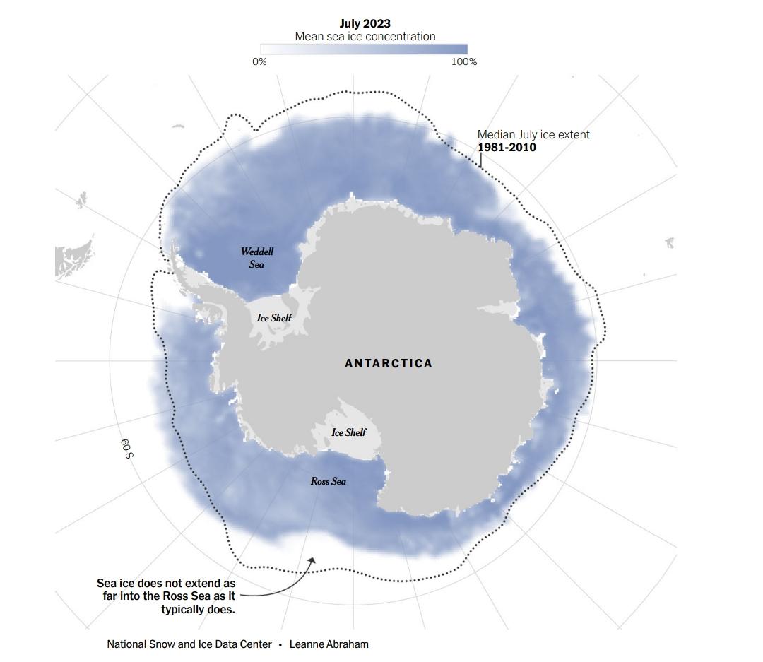 Erdenesanaa, Delger y Leanne Abraham [2023], "Antarctic Sea Ice Is at a 'Very Concerning' Record Low", The New York Times, New York, 2 de agosto, https://www.nytimes.com/2023/08/02/climate/antarctic-sea-ice-record-low....