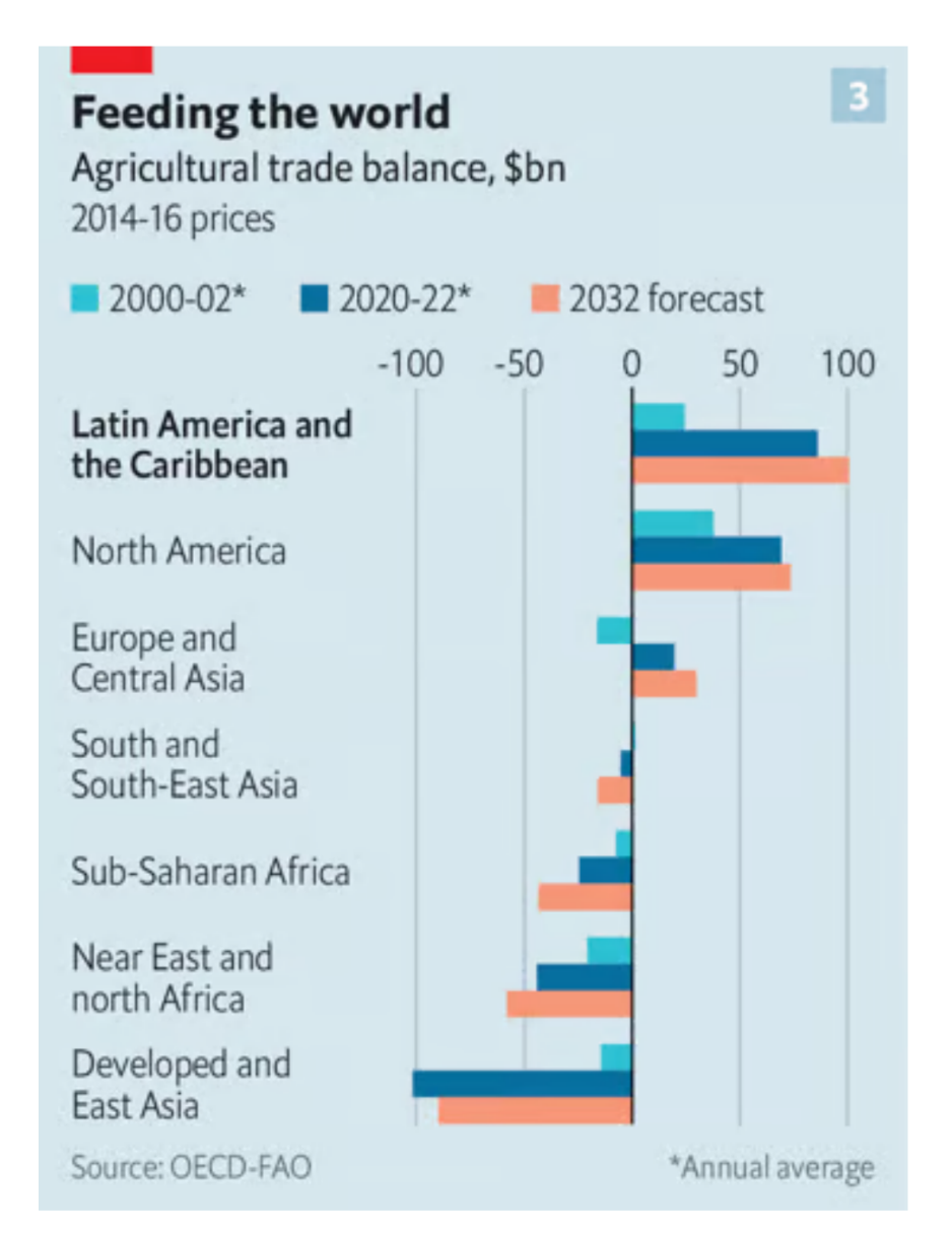 8. América Latina es el mayor exportador neto de alimentos del mundo. Proporciona 60% de la soya comercializada en el mundo, que China importa para alimentar a sus 450 millones de cerdos. También suministra más de 30% de la oferta mundial de maíz, carne de res, aves y azúcar. Se espera que las exportaciones netas aumenten 17 % en la próxima década hasta alcanzar los 100 mil millones de dólares.