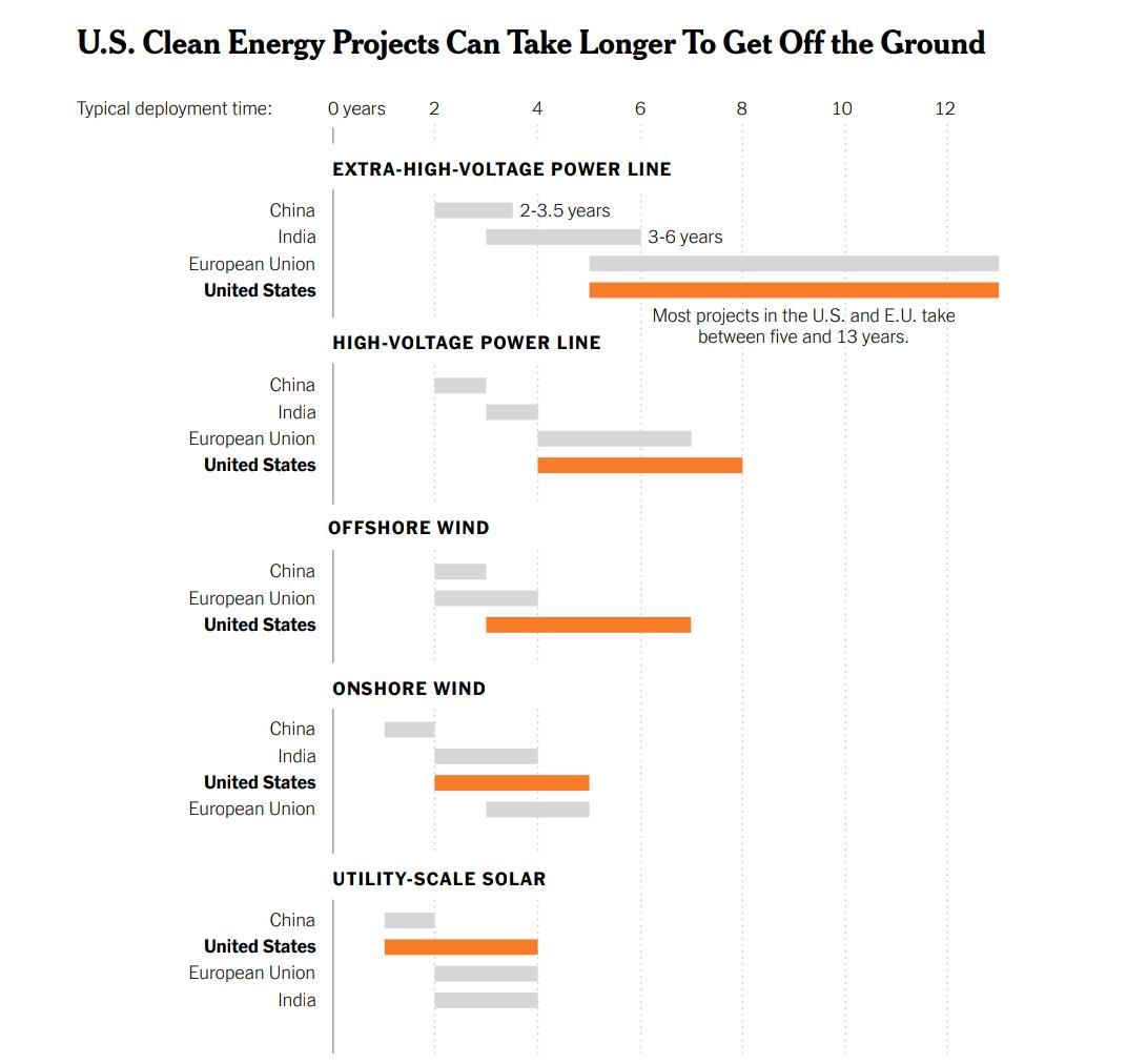 Estados Unidos es un país que tiene muchos recursos para la generación de energía renovable, sin embargo, para poder aprovechar tales recursos, es necesario la construcción de nuevas líneas de transmisión de alto voltaje. Pero la construcción de estas líneas está limitada por los permisos que pueden tomar más de 10 años.