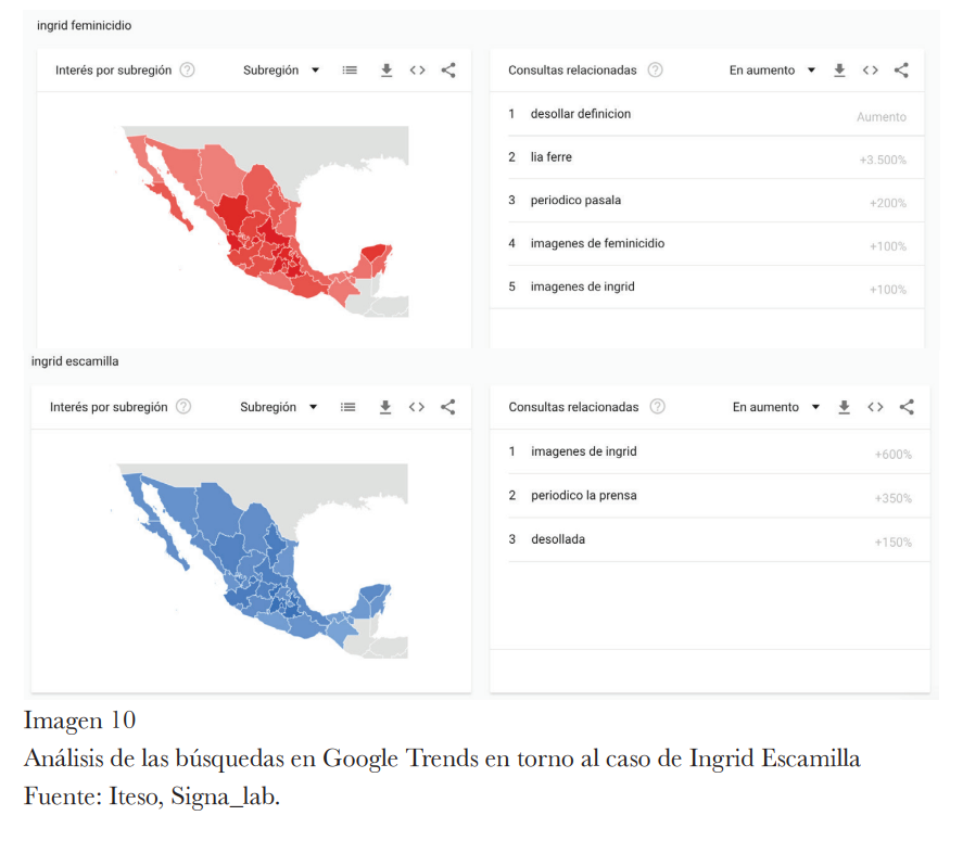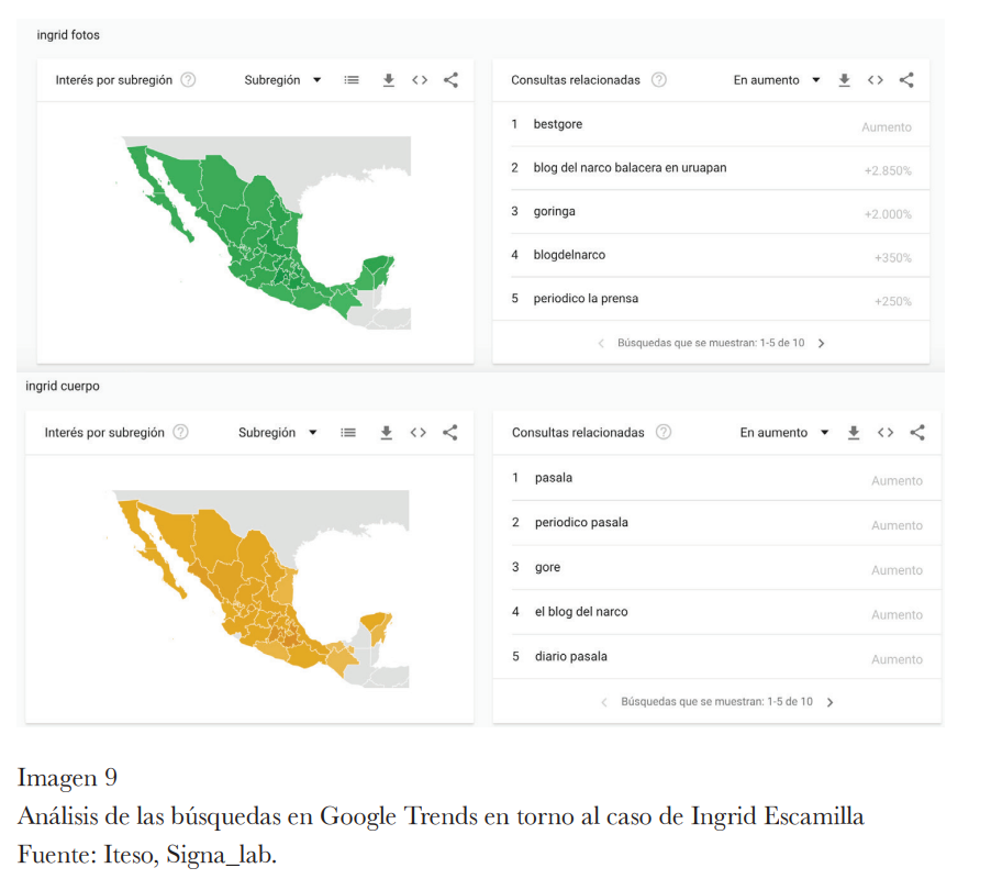 La información obtenida mediante Google Trends, una herramienta que permite medir y analizar las búsquedas en Google, muestra que la violencia ha colonizado gran parte del imaginario en México. Los resultados de los datos indican que en un primer momento la mirada que predominada sobre el caso de Ingrid estaba anclada a las gramáticas del terror. En otras palabras, la forma de acercarse al caso se basaba en el consumo de información “heredado de estrategias mediáticas que tienden a atenuar la sensibilidad frente a la barbarie” (p.25); en el caso de Ingrid las búsquedas utilizaban palabras que muestran una narrativa que exacerbó la brutalidad del feminicidio.