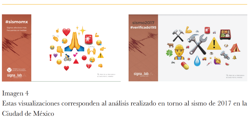 Siguiendo esta línea de pensamiento, Reguillo se pregunta qué color tiene una tragedia, cuáles son los emojis de un sentimiento, y si la tragedia tiene rostro. Para estas dudas hay que preguntar a los datos por las conexiones, abordando lo digital como un modelador de la producción social de sentido. Los emojis permiten captar las tonalidades afectivas de las conversaciones digitales, tal como mostró el cambio de narrativa cuando en el terremoto del 17 de septiembre de 2017 en México, se pasó de la alerta por sismo a la verificación de la catástrofe.