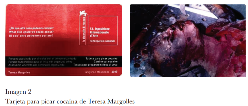 En 2009, la artista Teresa Margolles y el curador Cuauhtémoc Medina presentaron la obra artística ¿De qué otra cosa podríamos hablar? en la que mediante trozos de tela con sangre de víctimas de ejecuciones se muestra la atrocidad de las violencias en nuestro país. De esta obra, una pieza destacable es “Tarjeta para picar cocaína”, que consiste en repartir tarjetas de plástico duro en las que uno de sus lados muestra el rostro de una persona asesinada. Se trata de un recurso para obligar al público a tomar conciencia de su eventual participación en la economía de sangre.