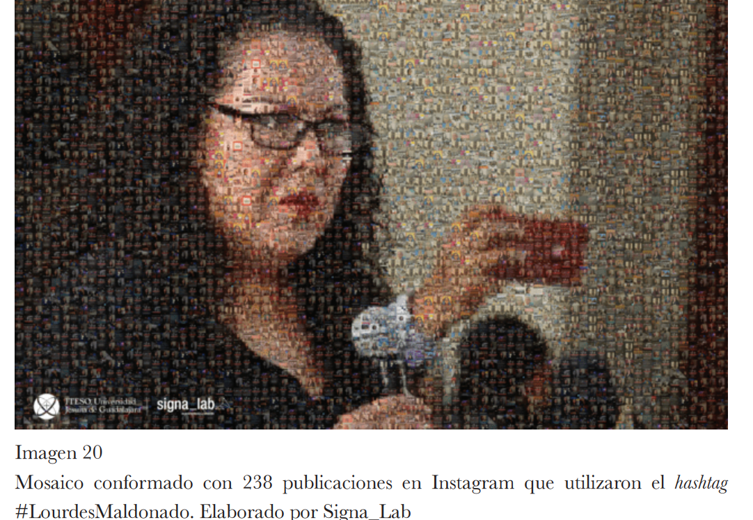 Para cerrar articulando los tres ejes que guían el trabajo de Reguillo, se presenta un análisis realizado en Signa_Lab sobre el caso del asesinato de la periodista Lourdes Maldonado. Dicho laboratorio rindió un homenaje digital al tiempo que realizó una denuncia mediante un mural con diversas publicaciones en Instagram que referían a la periodista y que conformaban una imagen de cuando Maldonado fue a la conferencia matutina del presidente López Obrador a denunciar que estaba siendo amenazada. El asesinato de Lourdes fue atroz. La representación mural de este tipo logra activar reacciones y sentimientos empáticos que se derivan de todo lo que dicen las múltiples imágenes que conforman el cuadro.