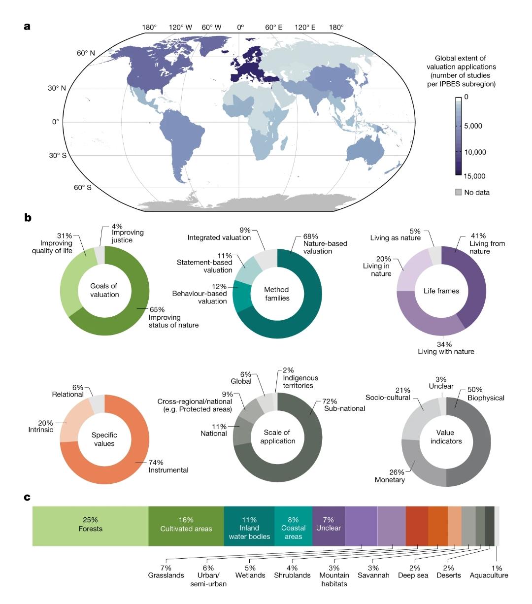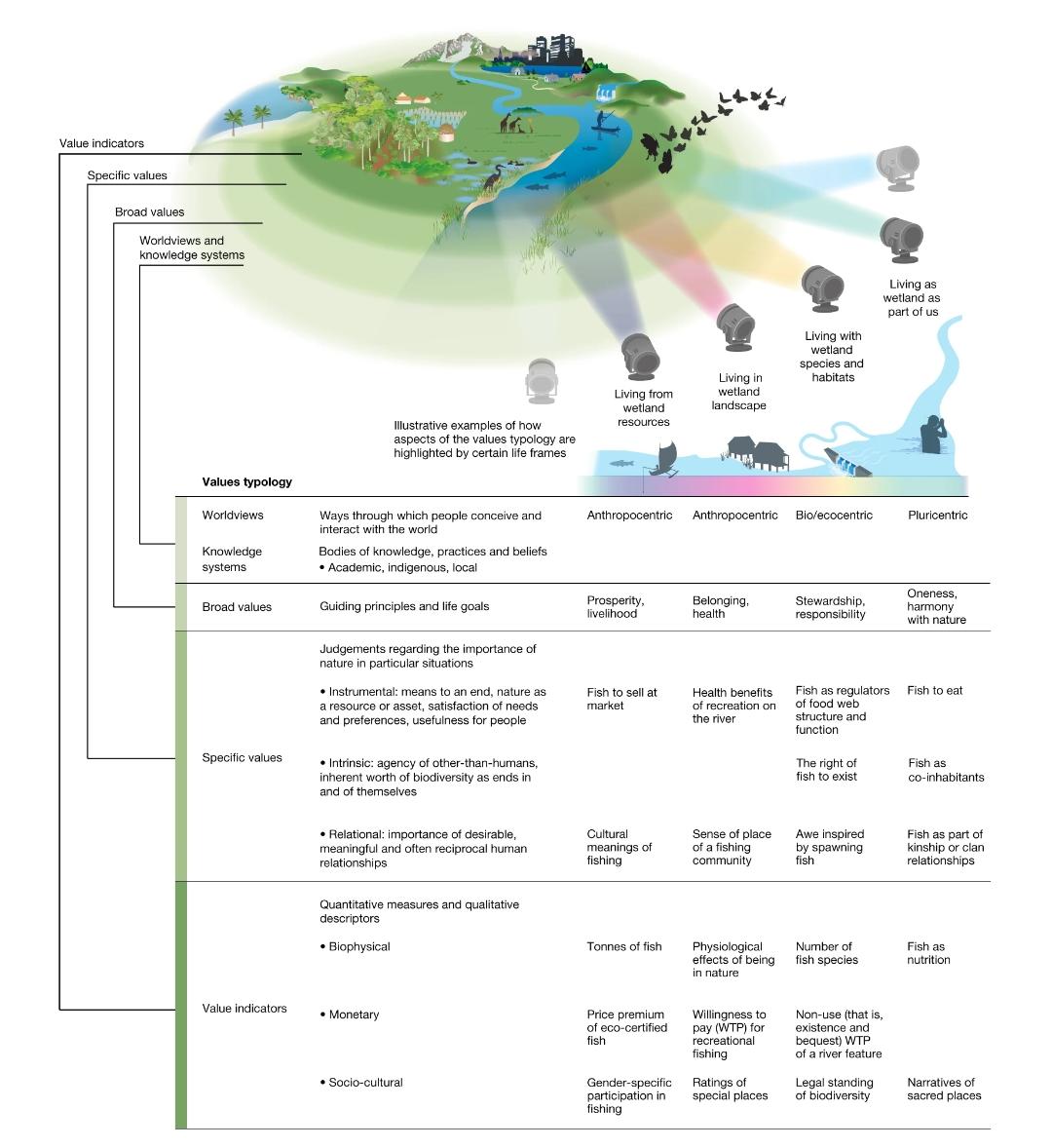 En el mundo, existen diferentes tipos de valoración de la naturaleza. En sociedades postindustriales con una alta seguridad material, alta seguridad material, que se refiere al acceso a los bienes materiales, comienza a ser cada vez mayor la aceptación de una valoración relacional e intrínseca. En cambio, en el Sur Global, donde la seguridad material es menor, se le da un valor instrumental. Desde el conocimiento indígena y local también existen cosmovisiones como Buen vivir en América del Sur, Ubuntu en África Subsahariana y Satoyama en Japón, todas ellas tienen su propia visión de la relación entre los humanos y la naturaleza.