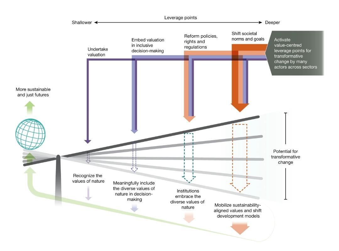 Para lograr cambios transformadores para cumplir los objetivos de la biodiversidad se debe confrontar el status quo y los intereses vinculados a las instituciones actuales. De igual forma, es necesario reconocer e integrar los diversos valores de la naturaleza en la toma de decisiones. Los valores instrumentales deben equilibrarse con los valores relacionales, intrínsecos y los no relacionados con el mercado, ya que estos también son indispensables en las razones que por qué la naturaleza es importante para las personas. Llegar a futuros más justos y sostenibles implica movilizar y fomentar valores amplios y nievas normas y objetivos sociales.