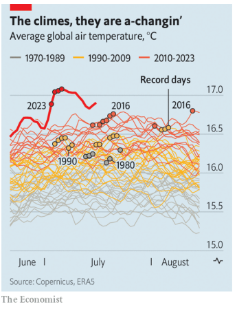 Sorprende el hecho de que las altas temperaturas sigan registrando máximos desde 2022. Pero lo más sorprendente es que precisamente en el mes de julio –el verano– del presente año se alcancen las temperaturas más altas mucho más antes y con mayor prolongación que de lo acostumbrado (dato crucial 1). No solo eso, los océanos también se están calentando (dato crucial 2) y en suma, los efectos de las altas temperaturas se están resintiendo sobre naciones y su población (datos cruciales 3 y 4).