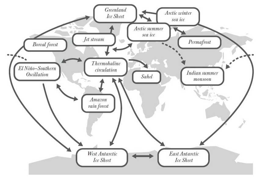 Si el hielo marino en el Ártico continúa reduciéndose y adelgazando cada verano, agua oscura quedará expuesta debajo, esta agua absorbe más calor que el hielo, por lo que adelgazaría cada vez más el hielo. Al calentarse el Ártico, el permafrost del norte de Canadá y Rusia comenzarían a descongelarse, con lo que se liberarían gases de efecto invernadero. Las temperaturas altas secarían los bosques, haciendo que sean más propensos a los incendios. Con el colapso de los glaciares, una gran cantidad de agua dulce llegaría al Atlántico norte, es decir, esto alteraría la circulación del océano. Este cambio en la circulación llevaría a la acumulación de agua cálida en Antártida, lo que provocaría el derretimiento de los glaciares. Este escenario se podría presentar si la temperatura llega a un calentamiento global entre 1 y 3°C. El planeta ya ha llegado a una temperatura de 1.1°C, es decir, el planeta y la humanidad ya están en una zona de peligro.