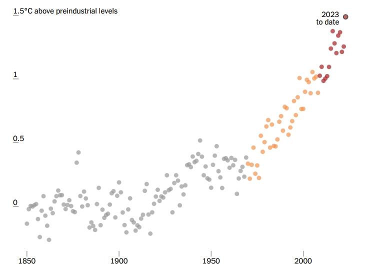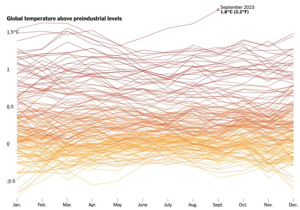 Berkeley Earth, una organización independiente que analiza datos ambientales, publicó una serie de datos que indican que septiembre de 2023 fue 0.5°C más caliente que el récord anterior para ese mes, de la misma manera, julio y agosto de 2023 fueron 0.3°C más calientes en comparación con otros años. Estos datos llevan a que 2023 sea considerado el año más caluroso desde que se comenzó a obtener registros de temperatura a nivel global (dato crucial 1).