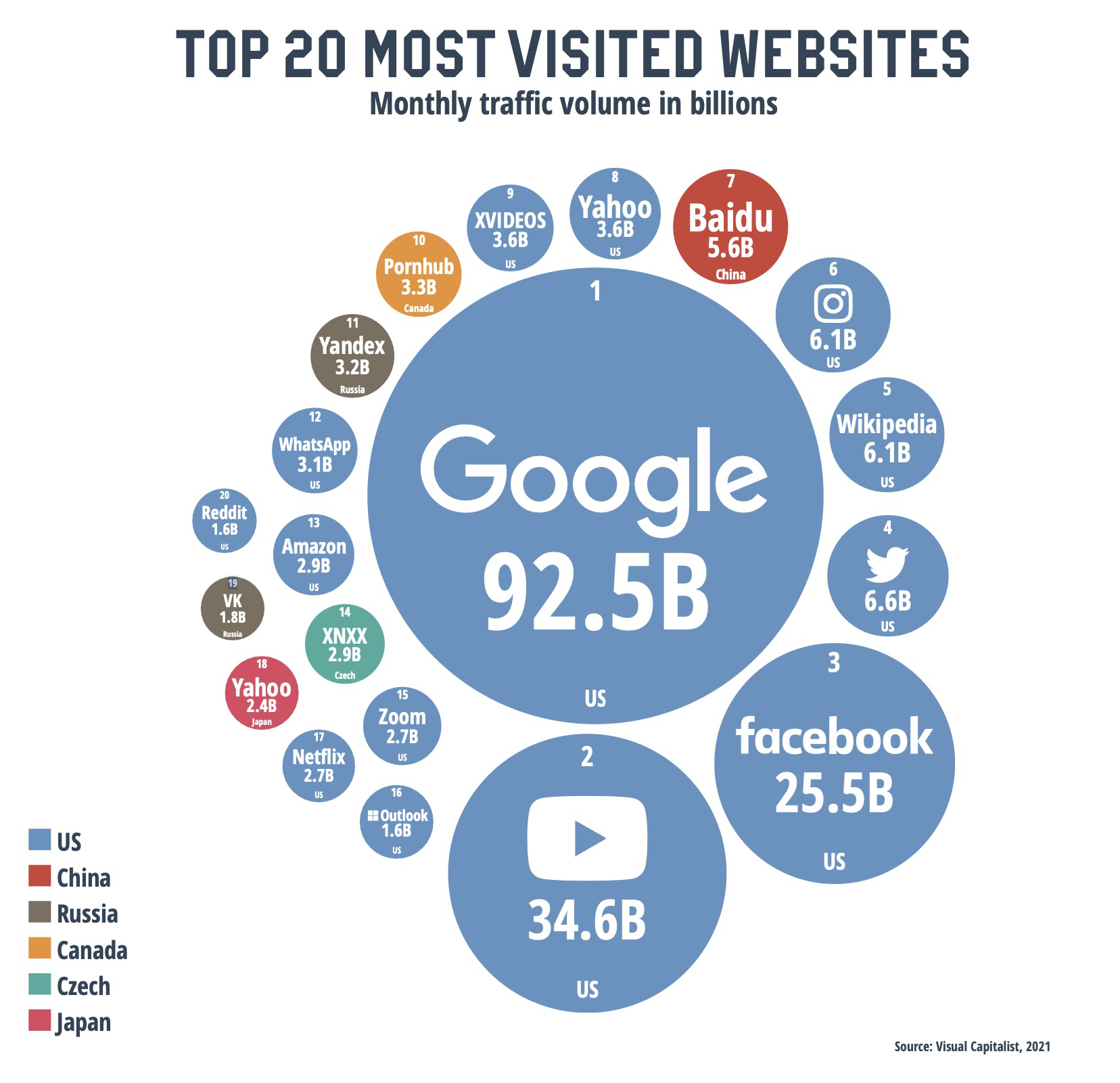 4. Algunos datos que reflejan la dimensión del uso masivo de la Big Tech, de acuerdo con el reporte del Congreso de Estados Unidos, titulado Investigation Of Competition On Digital Markets. Majority Staff Report And Recommendations. Subcommittee On Antitrust, Commercial And Administrative Law Of The Committee On The Judiciary (2020), son los siguientes: 81% de todas las búsquedas generales y el 94% de todas las búsquedas en teléfonos móviles utilizan Google; 99% de los smartphones utilizan sistemas operativos de Android o iPhone; 80% de los navegadores web empleados son Google Chrome o Apple Safari; 2.4 millones de usuarios y usuarias acceden diario al conjunto de Facebook, Instagram, Messenger y WhatsApp; aproximadamente 50% de todo el comercio electrónico de Estados Unidos se hace por Amazon; y la infraestructura informática de la “nube” está acaparada por Amazon, Microsoft y Google. En la gráfica 3 se aprecian cuáles son los 20 sitios web más visitados en el mundo, por cantidad promedio de personas que acceden a ellos mensualmente.