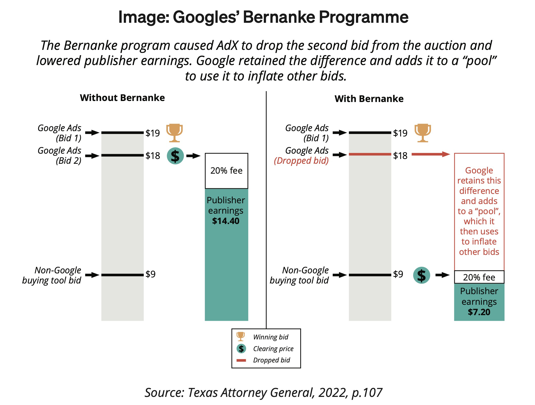 A pesar de que Google hizo de conocimiento público que su sistema de intercambio de anuncios,Google AdX, estaba diseñado con base en subastas de segundo precio y que cambió en secreto a subastas de tercer precio, según la demanda hecha contra el Project Bernanke. Asimismo, el litigio liderado por el estado de Texas apuntaba que, mientras anunciantes y publicadores recibían la tercera oferta más alta (cuando debían haber estado recibiendo la segunda), Google se quedaba con la diferencia del precio entre ésta y el precio de la segunda oferta más alta. Con los “ingresos adicionales”, Google infló las ofertas sus anunciantes en Google Ads, para que pudieran ganar más impresiones, las cuales podrían haber perdido frente a anunciantes que ofertaban con herramientas de compra ajenas a Google. En resumen: Google cobró de más a sus anunciantes y a sus publicadores les pago menos de lo debido, porque controla las tecnologías y la arquitectura de fijación de precios de mercado, motivo por el cual diseñó el mercado para beneficiarse a sí mismo y deshacerse de la competencia (Dato crucial 2).